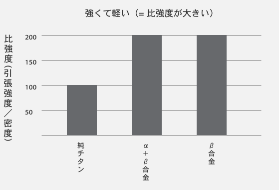 例として、代表的なステンレスSUS304は63.1N/㎣、純チタン(2種)75N/㎣のため、チタンの方が高い比強度となります。また、比重もSUS304の約60%なので、半分ほどの重量となります。