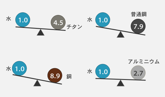チタンは比重4.51で銅の約1/2、鉄(SUS304)の60%の軽さを持つ。