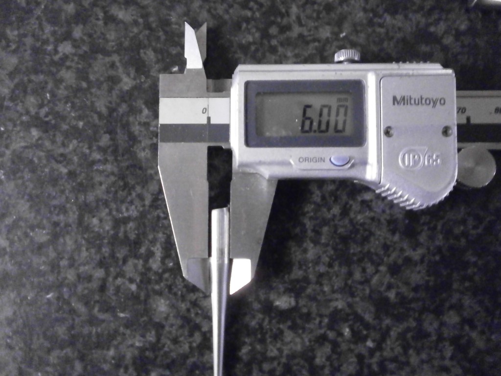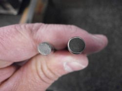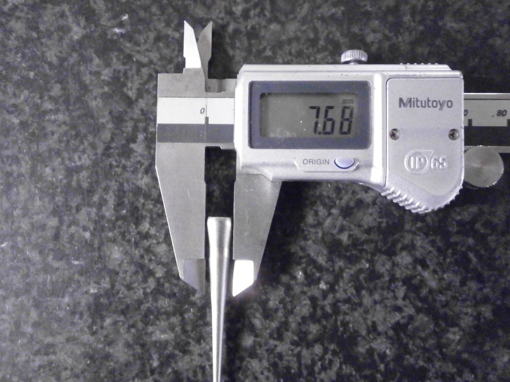 素材(CNC加工品)の先端部をプレス加工して、部分的に元線形を太くする加工です。