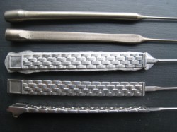 ホーム 加工事例 プレス・鍛造・圧延 Tiコイル材(スウェ-ジング加工品)からの加工の一例 チタンクリエーター福井の加工事例 Tiコイル材(スウェ-ジング加工品)からの加工の一例 素材Φ6.5→t1.7の加工率の高い加工です。 加工率の高いプレスで、細かなメリハリのついた加工をするには、複数回のプレスが必要です。 写真1は加工工程の順番になります。(工程は抜粋となっております) 工程の間には、熱処理(焼鈍)・バレル研磨加工・バフ加工等があり、全工程数は20程度になります。 写真2,3が仕上がった部品(眼鏡の腕部品)です。 冷間鍛造ならではの、緻密な表面仕上がり・高い再現性を実現しております。 優れたチタン加工技術 チタン素材 プレス・鍛造・圧延 スウェージング 切削・転造 曲げ・プレス曲げ・コイリング 表面処理 研磨 レーザー加工 接合 その他の技術 加工事例 設備紹介 お知らせ ブログ お問い合わせ チタン・チタン合金の素材選定からスウェージング加工、切削加工、転造加工、圧延加工、ろう付、チタン塗装・メッキ、プレス加工、部品製造・プレス加工などチタン加工おのことなら何でもご相談ください。 よくあるご質問 お見積り・ご相談フォーム