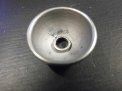 写真3,4…t0.5のチタンシート材の外形絞りと中心部のバーリング加工を同時に行なっております。