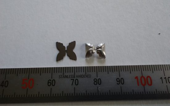 ホーム 加工事例 プレス・鍛造・圧延 チタン箔板(板厚0.15mm)からアクセサリー部品へプレス加工 チタンクリエーター福井の加工事例 チタン箔板(板厚0.15mm)からアクセサリー部品へプレス加工 チタン箔板 (t0.15) を、2工程 (板抜き→冷間鍛造加工) で加工した製品です。 写真では分かりづらくはありますが、平坦な板が見事に3D形状に成形されております。 通常は、バリを出してプレス加工するのですが、薄くて小さい形状のため、作業が困難となります。 そこでバリを出さずにプレス加工するために、板抜き形状を考慮して製作しております。 優れたチタン加工技術 チタン素材 プレス・鍛造・圧延 スウェージング 切削・転造 曲げ・プレス曲げ・コイリング 表面処理 研磨 レーザー加工 接合 その他の技術 加工事例 設備紹介 お知らせ ブログ お問い合わせ チタン・チタン合金の素材選定からスウェージング加工、切削加工、転造加工、圧延加工、ろう付、チタン塗装・メッキ、プレス加工、部品製造・プレス加工などチタン加工おのことなら何でもご相談ください。 よくあるご質問 お見積り・ご相談フォーム