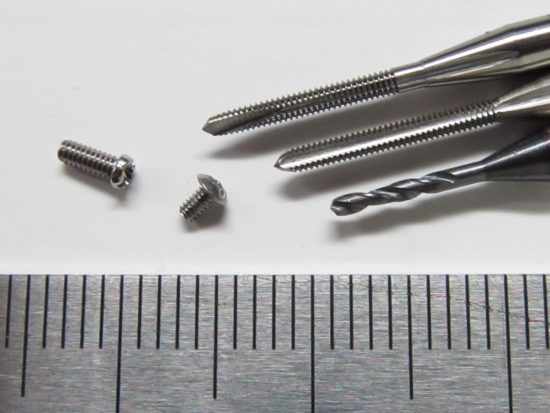 ホーム 加工事例 切削・転造 チタン板(t2.0)に小径ネジ(M1.4)用のタップ加工 チタンクリエーター福井の加工事例 チタン板(t2.0)に小径ネジ(M1.4)用のタップ加工 厚み2㎜のチタン板にマシニングセンターでタップ加工を行う事例です。 チタンに穴加工やタップ加工を行うと、すぐに熱が発生し、エンドミルやドリルが切れやんだり焼き付いてしまうため、油性や水溶性の切削油で十分に冷やしながら加工をします。 このような加工に使われる工具類と小径のネジがこちら タップ加工後には実際にネジを嵌めて確認をします。 優れたチタン加工技術 チタン素材 プレス・鍛造・圧延 スウェージング 切削・転造 曲げ・プレス曲げ・コイリング 表面処理 研磨 レーザー加工 接合 その他の技術 加工事例 設備紹介 お知らせ ブログ お問い合わせ チタン・チタン合金の素材選定からスウェージング加工、切削加工、転造加工、圧延加工、ろう付、チタン塗装・メッキ、プレス加工、部品製造・プレス加工などチタン加工おのことなら何でもご相談ください。 よくあるご質問 お見積り・ご相談フォーム