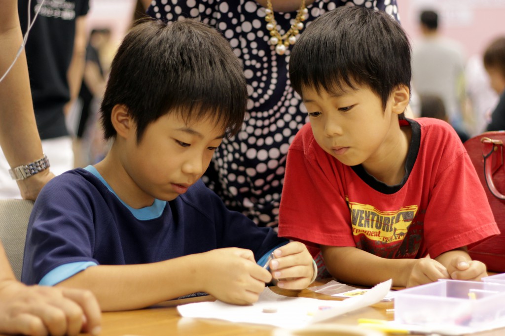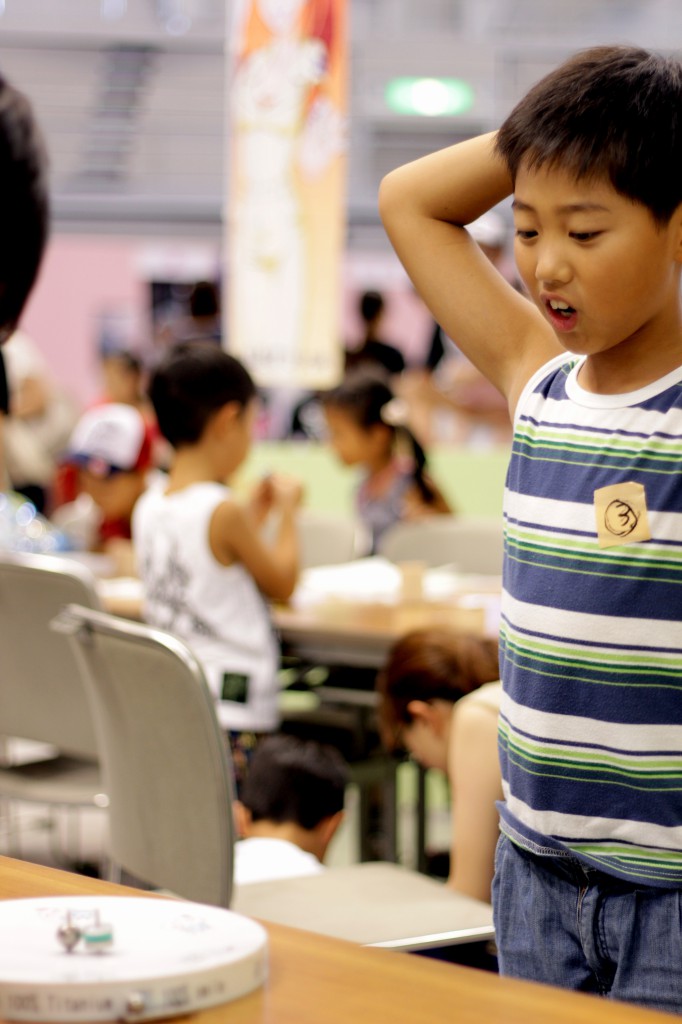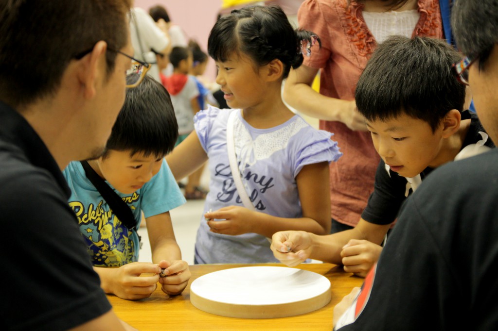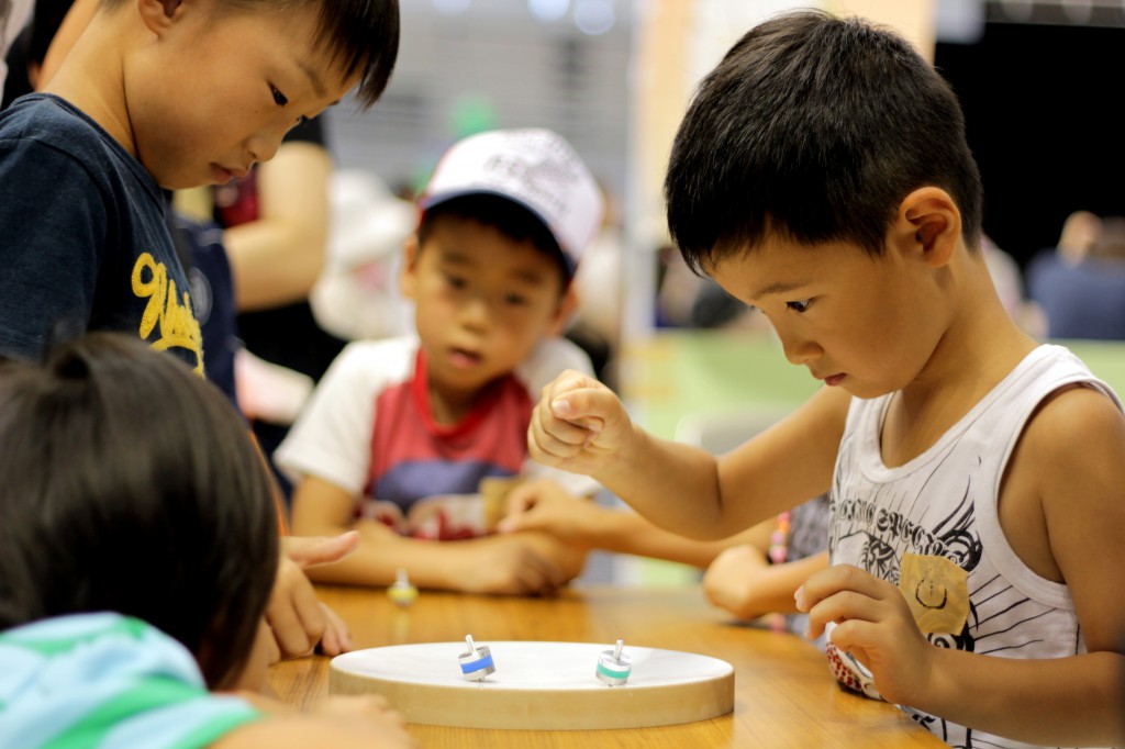 子供達に実際に組み立ててもらったコマを使って対戦してもらいました。 うまく回せずに端の方で何回も練習していた子、負けちゃって悔しくて泣いてしまった子、回っているコマを真剣に見ている表情に大人もスタッフも引き込まれて真剣に応援していました。
